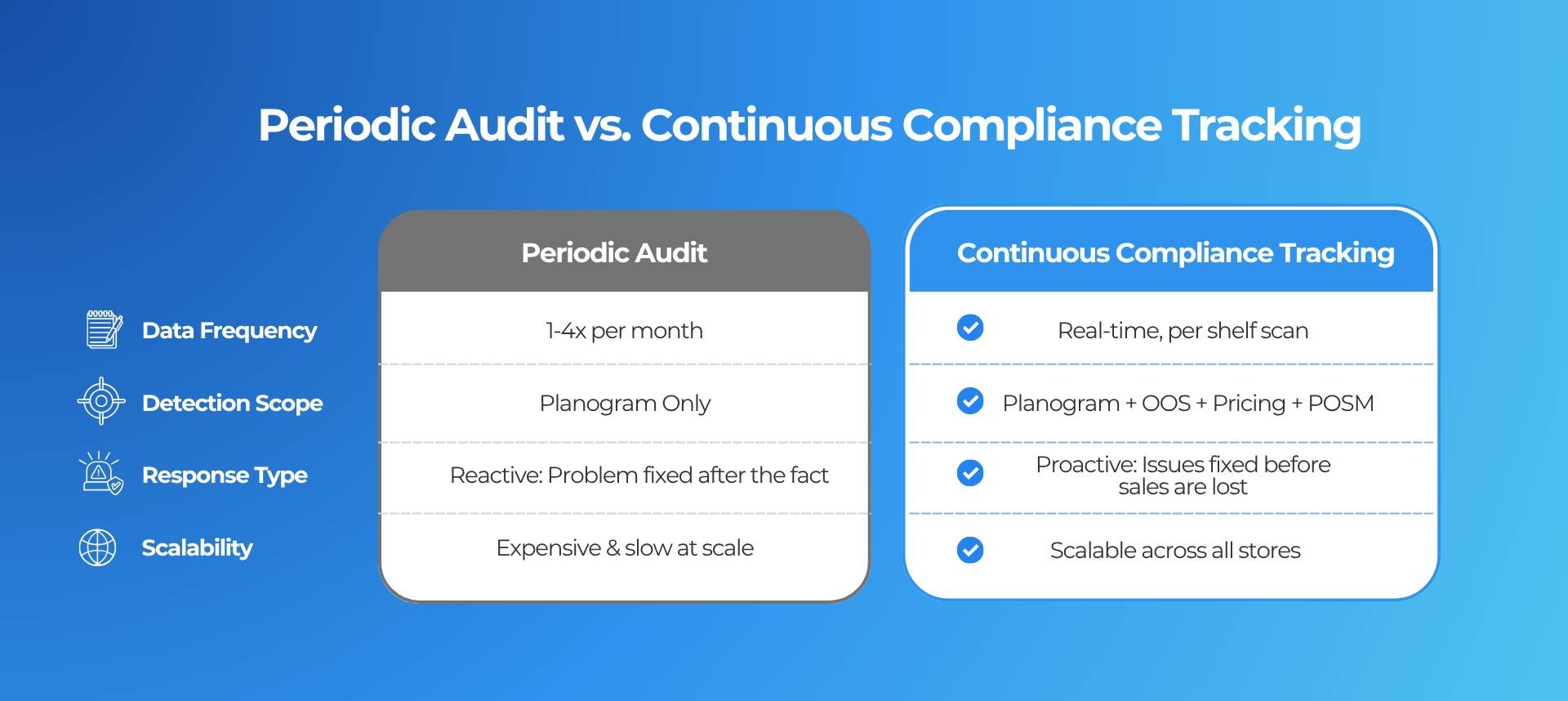 The traditional response to planogram compliance issues is the store audit. A field rep visits once a week or once a month, and a report comes back a few days later. By then, the shelf has already moved further from the plan. For CPG brands, it is even more costly.